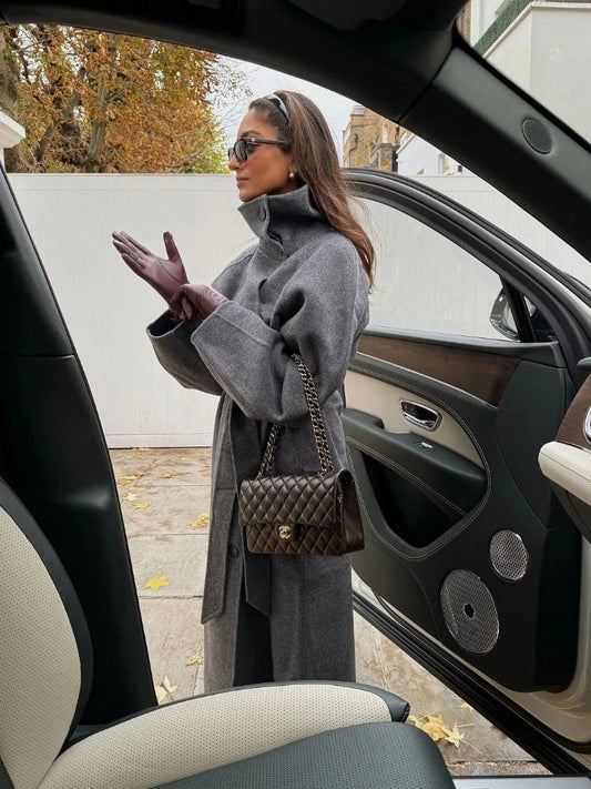 • Κομψό μακρύ παλτό από μαλλί για γυναίκες με όρθιο γιακά & ζώνη - Μοντέρνο χειμερινό πανωφόρι
