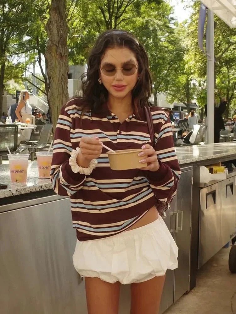 Introducing the Meldy Striped Casual Women's Polo T-Shirt, designed for a relaxed yet fashionable look. This versatile top features a button detail and is perfect for summer outings or casual gatherings. Crafted from lightweight fabric, it ensures comfort throughout the day.
